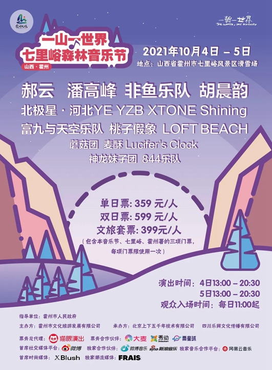 2021“一山一世界•七里峪森林音乐节”门票于2021月9日23日正式开售,乐迷可通过【猫眼演出】等平台购买。