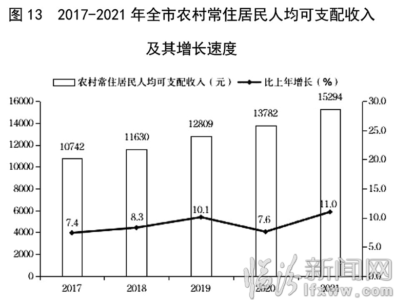 全年全市居民人均可支配收入25708元,比上年增长9.7%。其中,城镇常住居民人均可支配收入36968元,增长7.4%;农村常住居民人均可支配收入15294元,增长11.0%。居民人均消费支出13822元,增长10.2%。其中,城镇居民人均消费支出17945元,增长7.9%;农村居民人均消费支出11295元,增长11.8%。