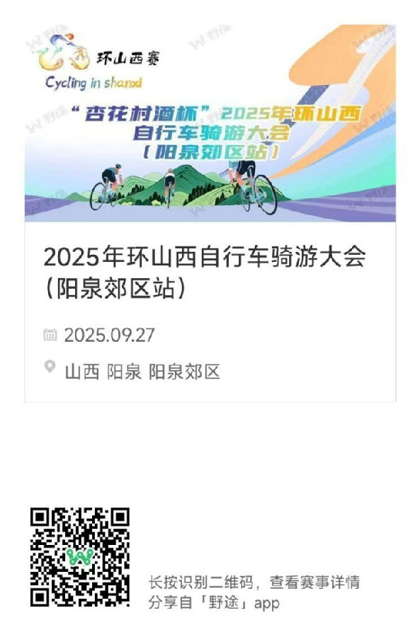 本次大赛的报名渠道现已开放,在此郑重邀请各地骑游选手踊跃参与。报名方式如下:登录 野途 APP,搜索“2025 年环山西自行车骑游大会(阳泉郊区站)”进行报名。