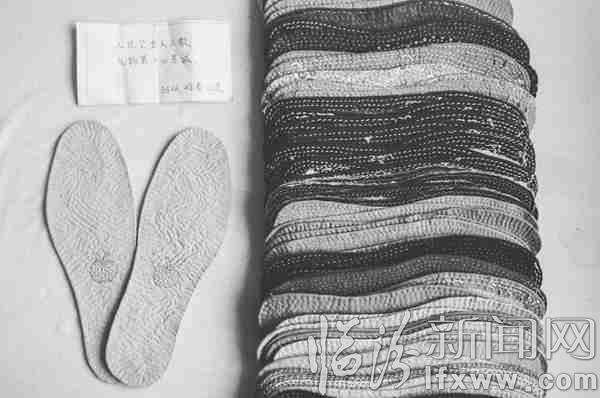 中队值班干部郭鹏打开一看,手提袋里折叠整齐、颜色不一的手工鞋垫,双双针脚细密、柔软厚实。