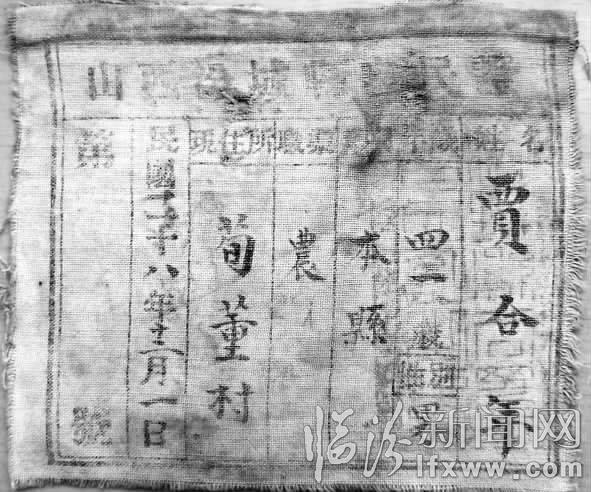 该“良民证”全称“山西汾城县良民证”,为格式化制式证件,布质,木版刷印,长9公分,宽7.5公分。