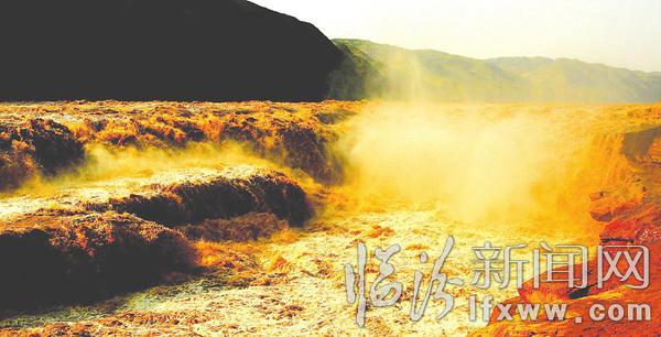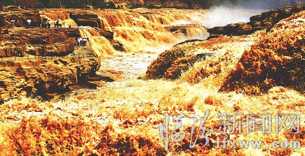 世界第一大黄色瀑布——壶口瀑布地处山西省吉县城西北25公里处的晋陕峡谷之中,因其气势磅礴而享誉中外。万里黄河流经此地,水面由300米宽乍缩为50余米,飞流直下,跌入落差30多米深的石槽中,形如巨壶注水,故名“壶口”。