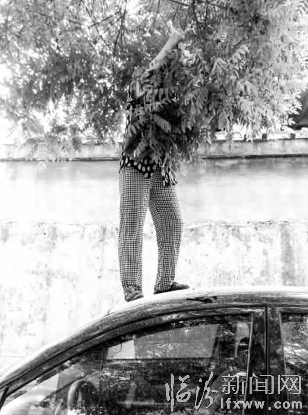 6月6日,在我市鼓楼北大街同向阳路交叉路口附近,一老年妇女为了采摘槐米,一大把年纪的她竟然不顾危险爬上树下停放的车辆顶部进行采摘,过往路人无不为其捏把汗!本报呼吁:请采摘者手下留情,不要方便了自己伤了城市的景!