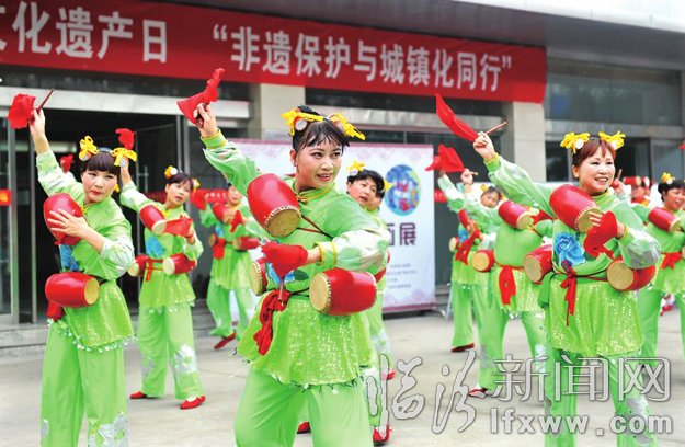 6月14日,演员在表演省级非遗项目《翼城花鼓》。当日是我国第九个文化遗产日,我市举办了主题为“非遗保护与城镇化同行”非遗项目展演活动,通过平阳木板年画展、剪纸艺术展及市民现场参与体验非遗项目等活动,倡导全社会保护文化遗产。