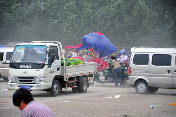 图3 16日屯里逢集,大风突然袭来,商贩们赶紧收拾货物。记者 张蕴强 摄