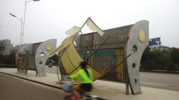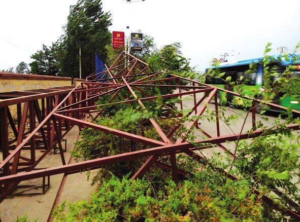 图6 滨河西路的一个公交站台,遮雨棚顶被大风掀翻。记者 郝海军 摄