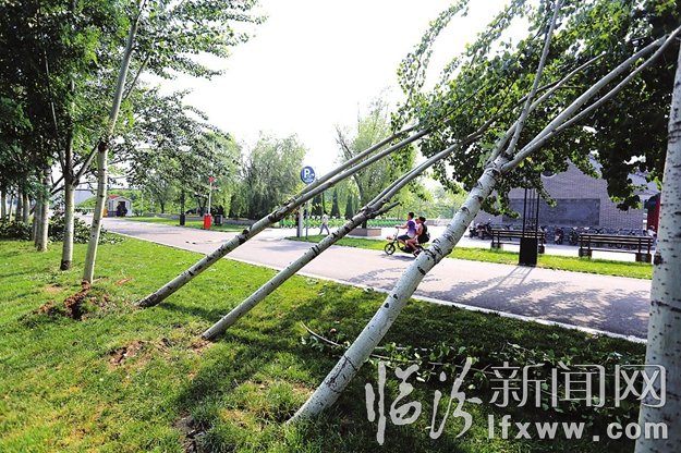 图8 6月16日19时,汾河公园内十余棵大树被大风连根拔起,数十棵杨树发生倾斜。 记者 苏亚兵 摄