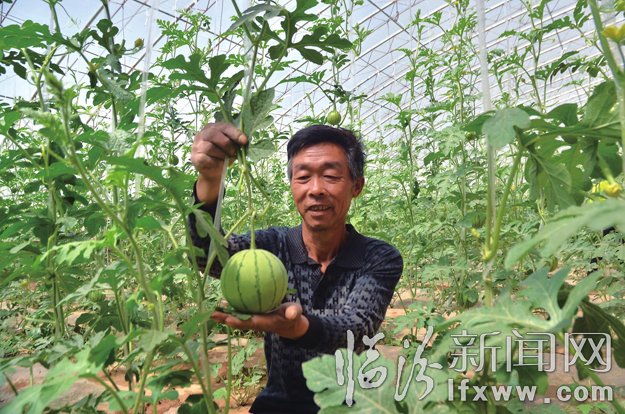 近日,在翼城县南唐乡符册村宝丰生态农场大棚内,一根根西瓜藤顺绳而上,挂着皮球般大小的西瓜,工作人员忙着为日渐长大的西瓜悬挂吊绳。据了解,该农场采用西瓜吊藤种植技术,可以提高土地利用率,使西瓜均匀受到光照,减少病虫害。 关川摄