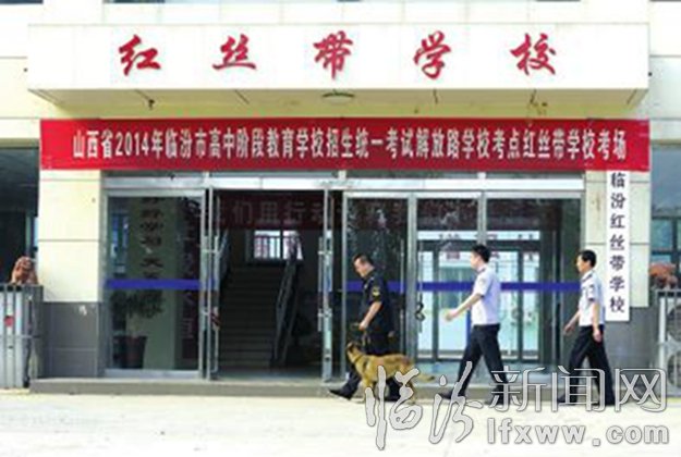 教学楼前悬挂着“山西省2014年临汾市高中阶段教学学校招生统一考试解放路学校考点红丝带学校考场”的红色条幅。校园里涉考区已划了警戒区域,公安民警正在现场值勤,学生们排队进入考场,监考教师认真核实每一位学生的准考证。