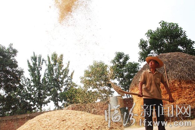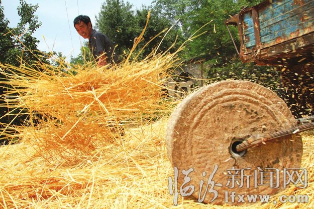 麦子割倒后,还得运回去晾晒,上午割的麦子,晒到下午三四点基本上就能碾了。“大约七八年前,我们村大多人还是用骡子、驴或牛、马来拉碾子将晾晒好的麦子脱粒,现在家家都有了三轮,也就没人养那些大牲口了。”正在打麦场用三轮碾麦子的村民李俊说,碾完麦子后,就是扬麦子,把麦粒和一些麦壳分离开。现在许多村民都使用鼓风机把麦壳吹出去,但也有人用传统的扬法。就是用木锨把麦粒和麦壳等杂物扬起来,靠风将麦壳和麦粒分开,不过许多年轻人都不会这种技术了。