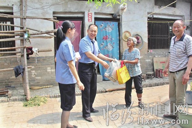 近日,襄汾县人民检察院的检察干警们深入新城镇曲里村,探访贫困群众,并将捐赠的物品送到贫困户手中。 张娟 张林虎 摄