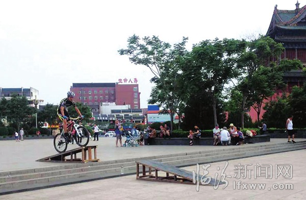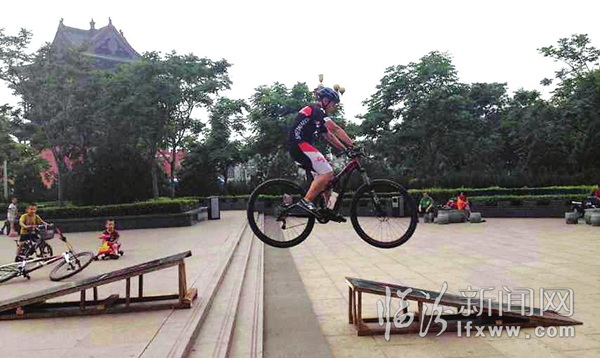 7月4日下午,记者在鼓楼广场看到一群年轻人脚踏山地车,飞跃在跳台之间。“飞跃是需要勇气的,每次飞跃都是对自身心理的一种挑战,同时也可以树立自信心。”记者 尹帅 见习记者 郭毅红 摄