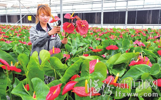 百里汾河尧都生态产业园自2010年启动以来,将现代农业、体验农业以及观光农业有机结合起来,带动了周边农民增收致富,目前,产业园内12栋智能连栋温室和43栋日光温室已投入使用。图为技术人员日前在百里汾河尧都生态产业园红掌智能大棚内整理花卉。本报记者 闫锐鹏 摄