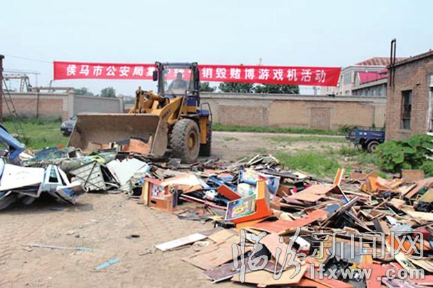 日前,侯马市公安局组织开展赌博机集中销毁活动,该局治安大队、各派出所在打击涉黄涉赌违法犯罪专项行动中收缴的85台赌博机集中销毁。图为民警正在动用铲车依法销毁赌博机。 郭清海 摄