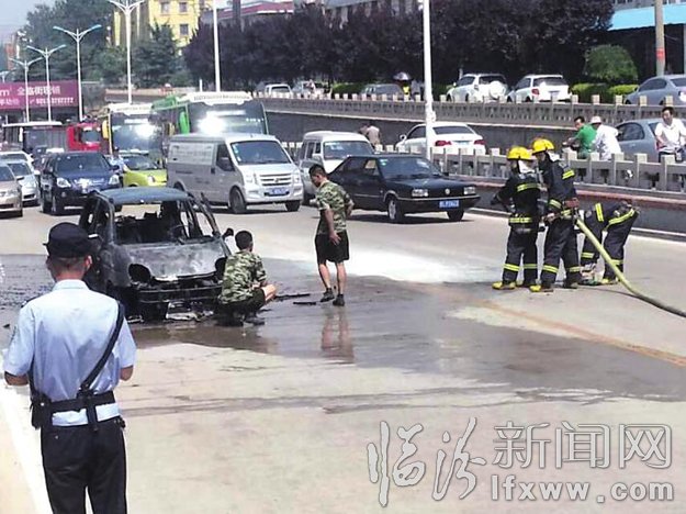 7月14日15时左右,市区解放路立交桥一辆自东向西的私家车在行驶中发生自燃。随后,火势被及时赶到的消防官兵控制,车辆损毁严重,但未有人员伤亡。