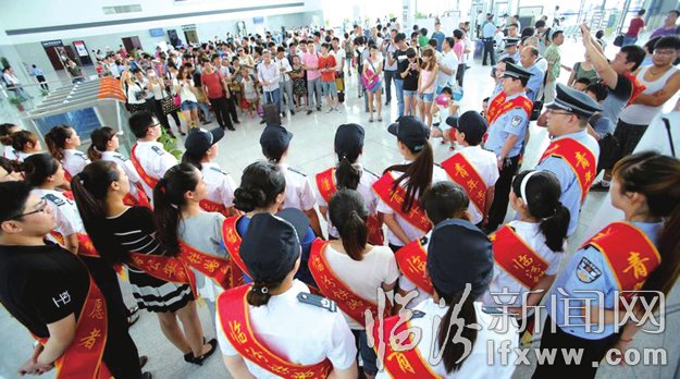 7月1日上午9时许,临汾西站候车室内人潮涌动、人声嘈杂。忽然,阵阵歌声传来,吸引了候车旅客的目光。40余名临汾铁路公安处民警和山西师范大学青年志愿者带着旅客一同唱歌,让喧闹的候车室瞬间变成了歌唱的舞台。倾情的“闪唱”,为旅客送来了温情祝福。随后,民警和志愿者们还积极为来往旅客提供志愿服务。