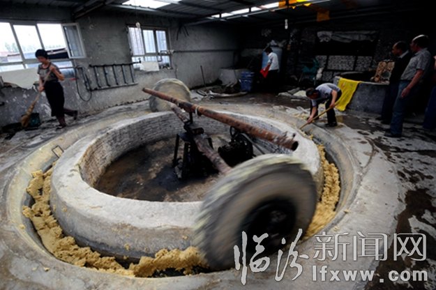 襄汾县邓庄镇西侯村帝尧麻笺厂的工作人员使用机器碾麻。