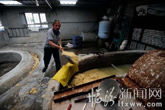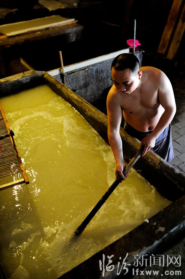 襄汾县帝尧麻笺厂的工人正在搅拌纸浆。