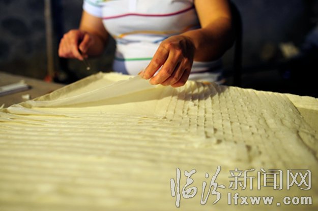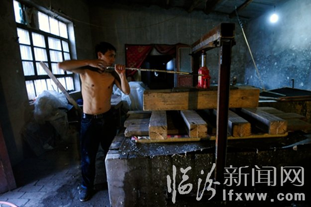 襄汾县帝尧麻笺长的工人正在压除纸浆中的水分。