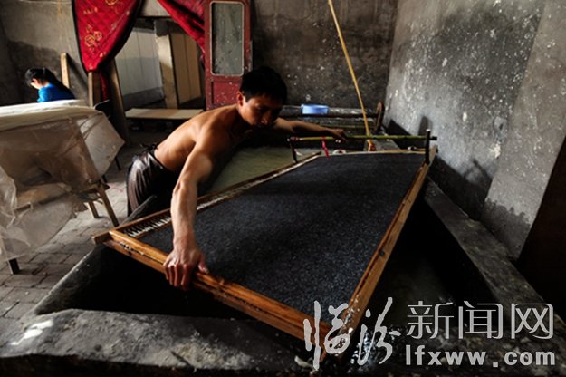 襄汾县帝尧麻笺厂的工人正在捞纸。