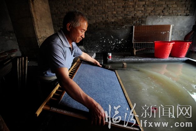 在襄汾县邓庄镇西侯村帝尧麻笺厂,有30年造纸经验的邓僧安老人在捞纸。