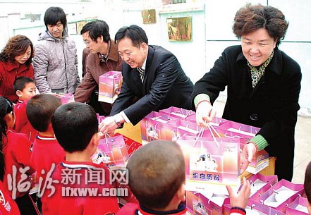 11月12日,深圳润帮事业有限公司总经理武军给临汾绿色港湾艾滋病区内的患儿送来了价值3万余元的营养品,并祝孩子们幸福快乐。图为市卫生局局长李玉琴、深圳润帮事业有限公司总经理武军为患儿们发放营养品。