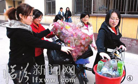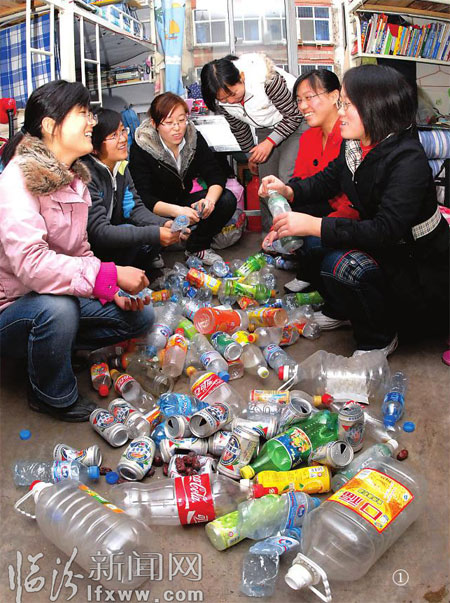 在山西师范大学校园里,物理与信息工程学院0602班的8名女学生,两年来利用课余时间捡回8000多个饮料瓶,用卖废品的钱建立“爱心账户”,并以爱心基金的名义为公益事业和四川地震灾区捐款1100余元。闫锐鹏摄