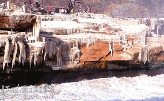12月7日,摄影爱好者齐聚吉县壶口景区拍摄冰挂景观。连日来,受强冷空气影响,地跨晋陕两省的壶口瀑布呈现出的冰挂、冰雕、彩虹等景观,引来了众多游人和摄影爱好者。 本报记者闫锐鹏摄