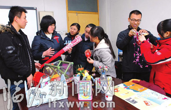 近日,山西师范大学化材学院举办了“环保制作、变废为宝”手工艺品制作大赛,参赛选手利用废弃杂物制作出精美的工艺品,号召周围的同学共同关注生存环境,崇尚绿色生活。图为12月25日,该校学生正在制作工艺品。