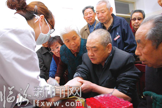 4月23日,市中西医结合医院的专家来到尧都区中心敬老院,为老人免费体检,讲解保健常识。本报记者闫锐鹏摄