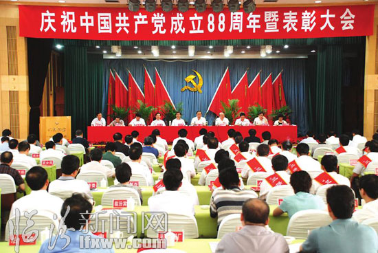 6月30日上午,我市召开庆祝中国共产党成立88周年暨表彰大会。会议号召全市各级党组织和广大共产党员要更加紧密地团结在以胡锦涛同志为总书记的党中央周围,按照中央、省委和市委的部署要求,坚持不懈地抓好自身建设,认真贯彻落实“保增长、保民生、保稳定”的各项措施,进一步坚定信念,围绕大局,着眼根本,强化创新,克难攻坚,扎实工作,推动全市经济社会平稳较快发展。