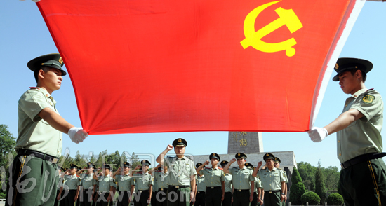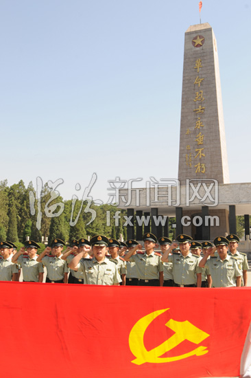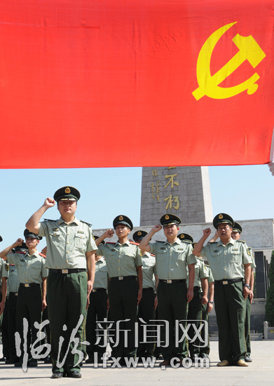 7月1日,在临汾烈士陵园英雄纪念碑前,党员们在重温入党誓言。 当日,是中国共产党成立88周年。临汾市公安消防支队组织党员来到烈士陵园,重温入党誓词,缅怀革命先烈的丰功伟绩。 临汾新闻网记者 李虎威 摄