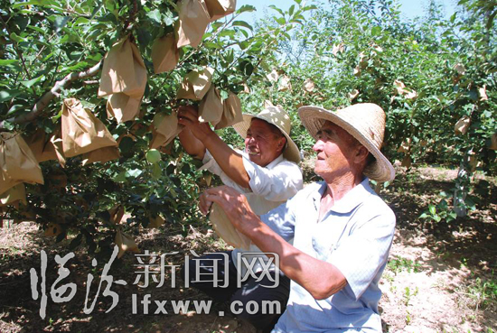 在吉县东城乡柏东村果园里,陈锁林和陈文城两位老人正在给苹果套袋,以避免农药污染,减少病虫侵害,成熟后的苹果果面外观光洁,价钱也能卖得好。 见习记者 李自强 摄