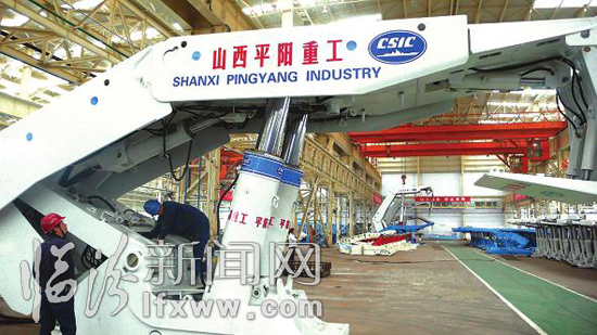 在山西平阳重工液压支架总装车间技术人员正在安装调试液压支架。该公司依靠自主创新, 生产出的高端液压支架装备了全国千万吨级以上煤矿的四百多个综采工作面。 冯文芳摄