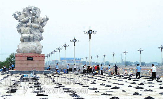 该桥桥墩护栏和桥面隔离带全部由1600多面造型各异的石鼓雕刻镶装,预计7月下旬竣工通车。 本报记者 闫锐鹏 摄