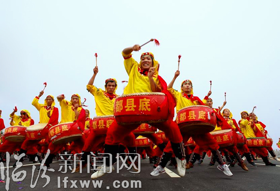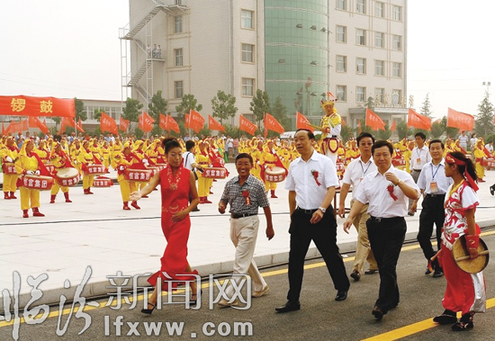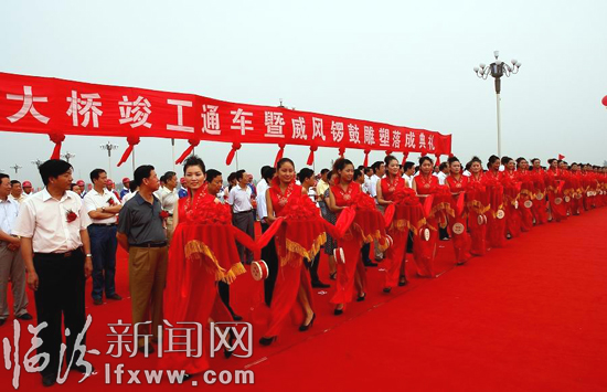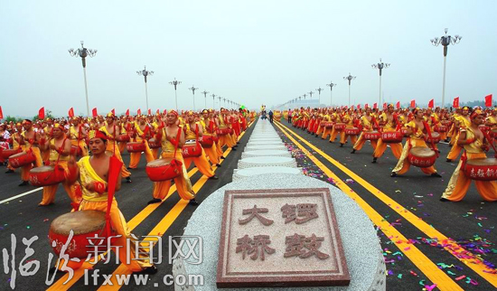 临汾新闻网讯 7月29日上午,新竣工的临汾锣鼓大桥彩旗招展,人流熙攘。伴随着七个方阵2000多人铿锵有力、响彻云霄的锣鼓声,声势浩大的锣鼓大桥竣工通车暨威风锣鼓雕塑落成典礼仪式在此举行。