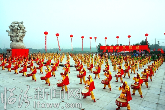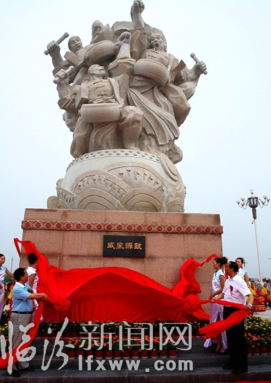 锣鼓大桥原名马务大桥,始建于1969年,是临汾历史上横跨汾河的第一座桥梁,也是连接汾河两岸、沟通东西两山的重要交通枢纽。曾于1998年拆除重建,2008年6月实施加固加宽改造,并于2009年7月全面竣工。新建的锣鼓大桥全长560米,宽55米,双向十车道,功能齐全,是全省第一座雕塑大桥,也是全国第一座以锣鼓文化为景观的桥梁。该桥以临汾威风锣鼓为主题,从桥墩、护栏到桥面中心隔离带,雕刻镶装1500多面石鼓,形态各异,气势壮观。大桥东西两侧新建四个锣鼓广场,面积60亩,绿化面积2.1万平方米。桥头四座威风锣鼓雕塑,高达13米,鼓、锣、钹、铙四种艺术造型威武壮美、气势磅礴,展现了临汾悠久厚重的历史文化和临汾人民勇往直前的豪壮情怀。锣鼓大桥的建设,把城市建设与文化旅游融为一体,是展示临汾形象的又一座文化景观,也是临汾城建史上又一座标志性建筑。 (摄影 武通凯)
