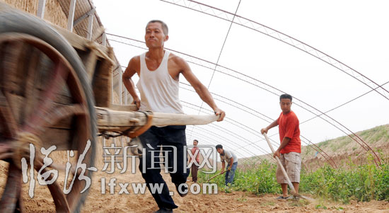 7月29日,在曲沃县史村镇西海村蔬菜大棚基地,农民张建国正和家人在平整土地。