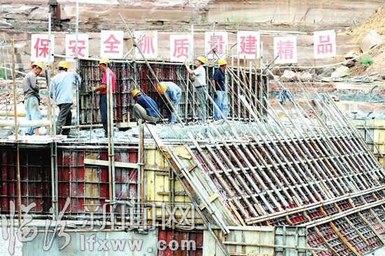 清峪水库是乡宁县响应省委、省政府“兴水战略”号召,为解决县城吃水问题建设的一处应急水源工程,预计2010年6月全面竣工。竣工后,每年可向县城及周边企业提供用水154.4万立方米,解决6万人的吃水问题,同时,可为下游4000亩耕地提供灌溉用水。图为8月12日,建设者在清峪水库工地紧张施工。 本报记者 李虎威 摄