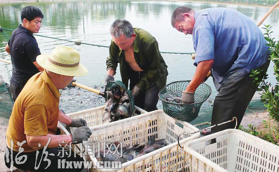 侯马市绿苑农业科技示范园利用温泉水养殖罗非鱼,喜获丰收。目前,该示范园已养殖罗非鱼20余亩,年获利可达70余万元。图为饲养员正在捕捞罗非鱼。冯文芳摄
