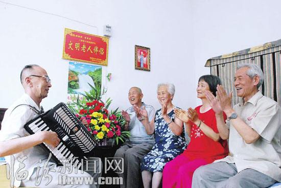 8月25日,尧都区中心敬老院的老人唱红色歌曲。随着新中国成立60周年之际的到来,该敬老院的老人们自发组成红歌演唱小组,排练经典红色歌曲,以饱满的热情迎接新中国60周年生日。 (记者闫锐鹏摄)