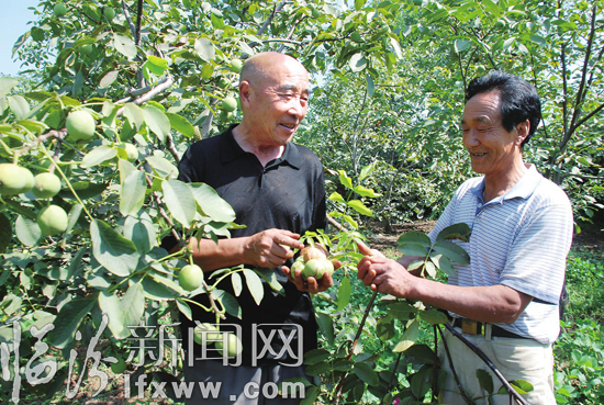 现年76岁的翼城县王庄乡弃里村农民技术员吉逢斗,30多年来致力于核桃树的栽植、嫁接、管护研究,由他改良的鲁光优良核桃品种,深受广大农民的欢迎。图为吉逢斗(左)正在和村民探讨核桃树种植的新思路。 本报记者 李自强 摄