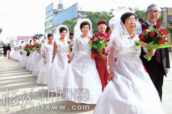9月9日,来自全市13个县(市、区)以及运城、阳泉的30对老年夫妇参加了我市首届夕阳红纪念婚礼。他们中年龄最大的80岁,最小的也已60岁。此次公益活动由民建临汾市委老龄委、市关工委以及市模特协会主办。图为老年夫妇们步入纪念婚礼的殿堂。 本报记者 闫锐鹏 摄