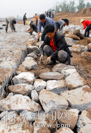 工人师傅用碎石填充铅丝笼