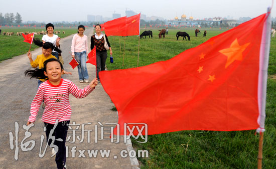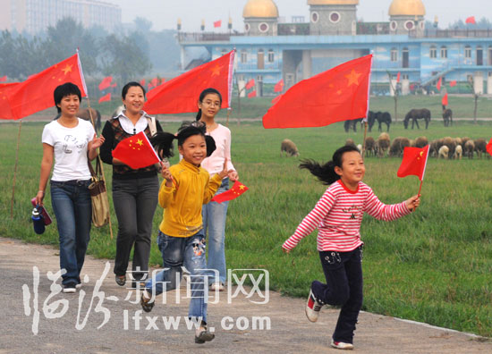 9月26日,小朋友手举国旗在高兴地玩耍。十一临近,山西省临汾市怡呼贝尔草原牧场挂起2009面国旗,迎接新中国60周年华诞。
