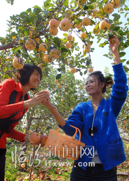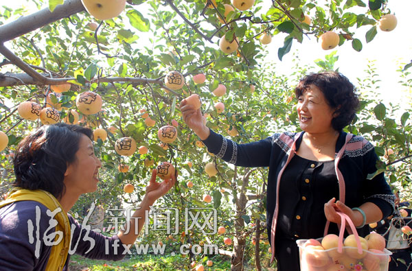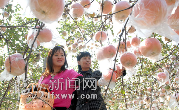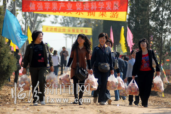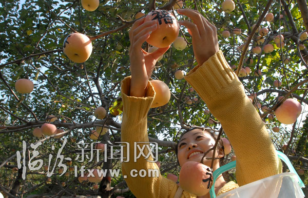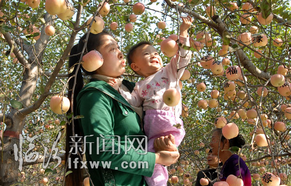 10月15日,游客在尧都区大阳镇上阳村苹果园体验采摘苹果的乐趣。当日,尧都区大阳镇上阳村主题为“放飞心情,快乐采摘"的首届苹果采摘旅游节开幕。全村3800亩挂满果实的优质苹果,吸引了众多游客前来观光、采摘。