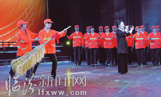 10月26日,市环卫局的职工在表演音乐剧。为庆祝全省第13届环卫工人节,市环卫局举办了“环卫之歌”大型文艺晚会,全市4700名环卫干部职工选送的自编自导的小品、舞蹈、音乐剧等节目展现了环卫工人的风采。 闫锐鹏 摄