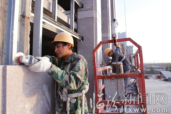 市“双百”项目之一的临汾经济技术开发区天鹅大酒店项目占地28亩,建设规模6.15万平方米,主体高26层,副楼高22层,总投资3亿元,规划为全市第一座五星级酒店。目前主体工程已完成,正在进行装修工程。图为建筑工人正在安装合金窗户。 本报记者 李自强 摄