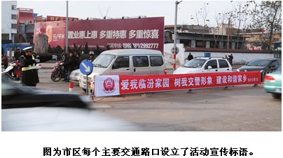 自我市启动“爱我临汾、树我形象、建我家乡”活动以来,市公安交警支队积极响应活动号召,全体干警以“降事故、保安全、保畅通”为工作中心,以规范执法为重点,以和谐警民关系为切入点,确立了“人人树形象,人人爱临汾,人人做贡献”的理念,规范交通规则、维护交通秩序,全力确保我市交通安全畅通。本报记者 赵俊堂 摄