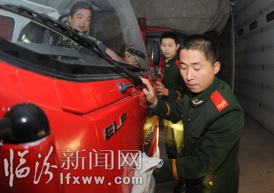 11月24日晚,尧都区公安消防中队即将退伍的老兵缪璐璐、刘威、吴飞最后一次擦拭着的战车。